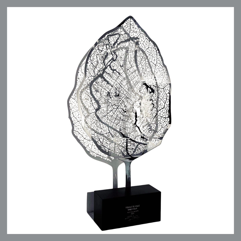 “La Feuille de Ville” weaves together urban maps and leaf veins, connecting nature and urbanity in a harmonious and positive dialogue. It unites two seemingly opposing structures — the urban and the organic — to reconcile them in a powerful ecological and civic statement: